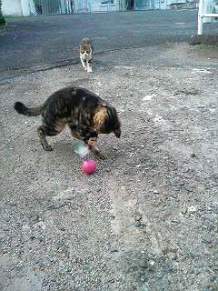 ネズミのオモチャを狙う、ミミゲとちびちび。