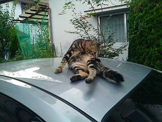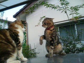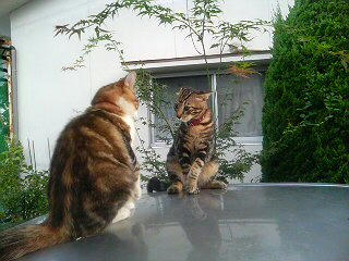 ちびちびとミミゲ、車の上で縄張り争いか!?