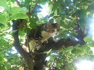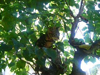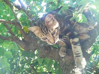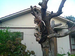 ミミゲとのじゃれ合い中に、木に逃げるちびちび。