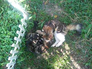 ミミゲとちびちび、草の上で取っ組み合い。