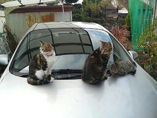 車の上でくつろぐナンコとちびちびとシマシマ。