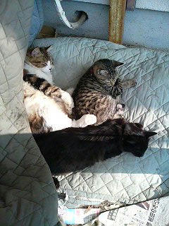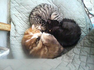 三匹で丸くなる。ミミゲ、クロクロ、シマシマの三つ巴。