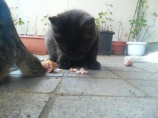 子猫たちが食べているとき、ナンコは見ているだけだから、