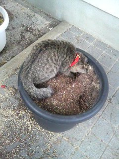 お気に入りの鉢植えに乗るしましま